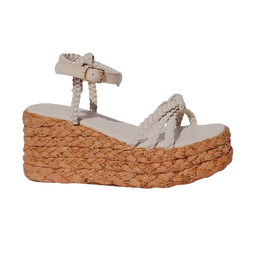 - Plataforma em cortiça trançada que une conforto e estilo natural;