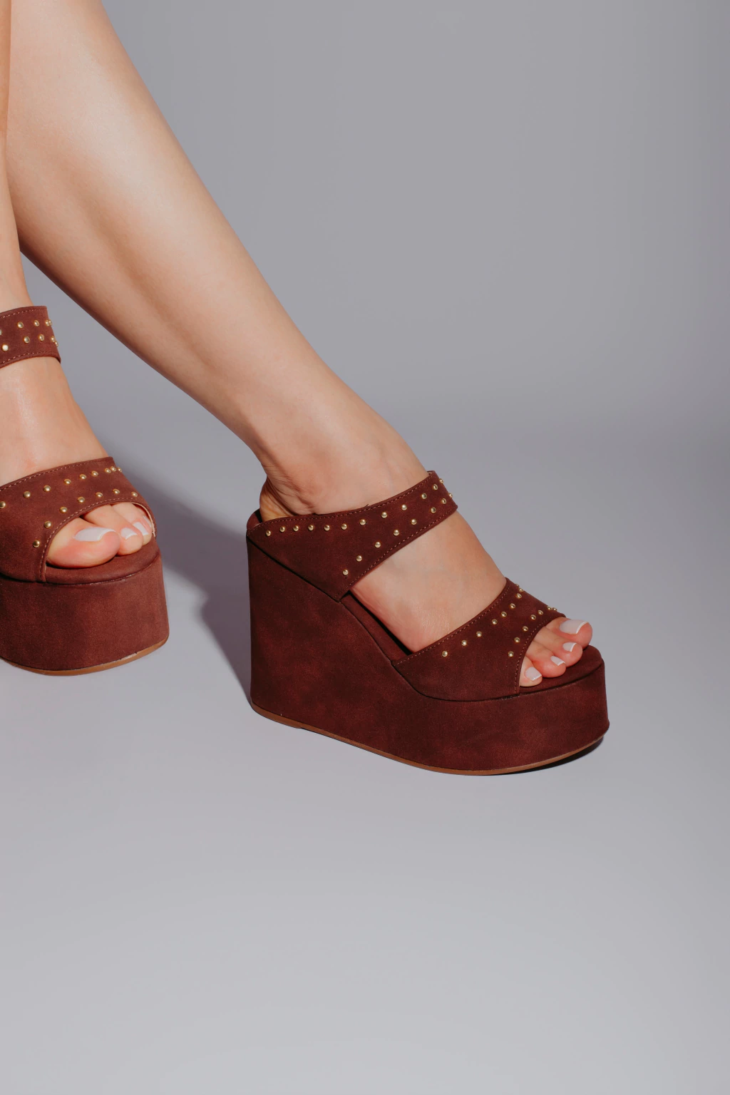 - Confeccionada em material boemia que remete à camurça, a Anabela Ellie traz aplicações delicadas de cravo distribuídas por toda a extensão do corte, adicionando um toque sofisticado e artesanal ao design.