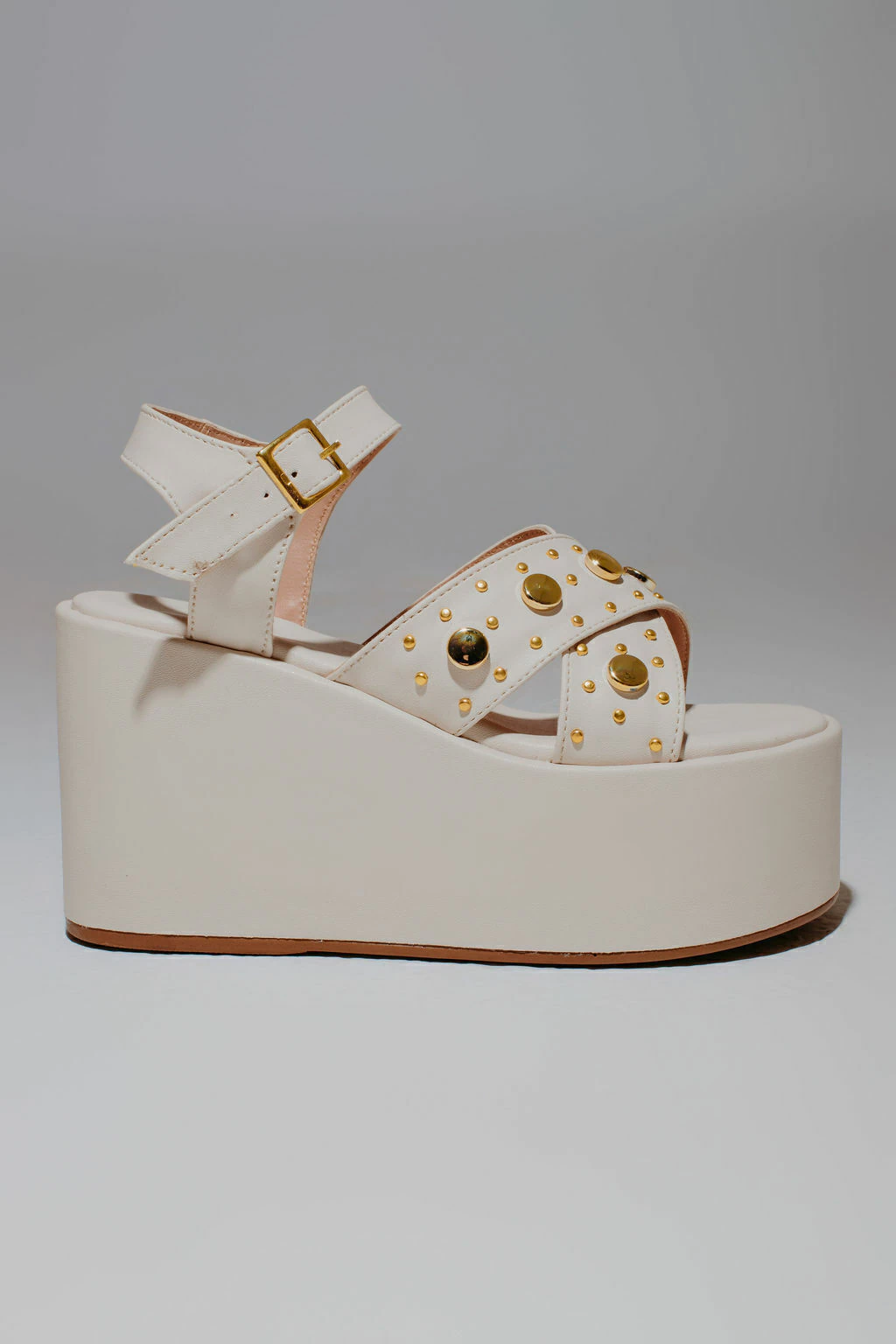 O design apresenta tiras cruzadas delicadamente adornadas com aplicações metálicas douradas e peroladas, trazendo um charme exclusivo e refinado. O fecho lateral com fivela dourada ajustável permite um ajuste perfeito, garantindo segurança e praticidade.