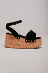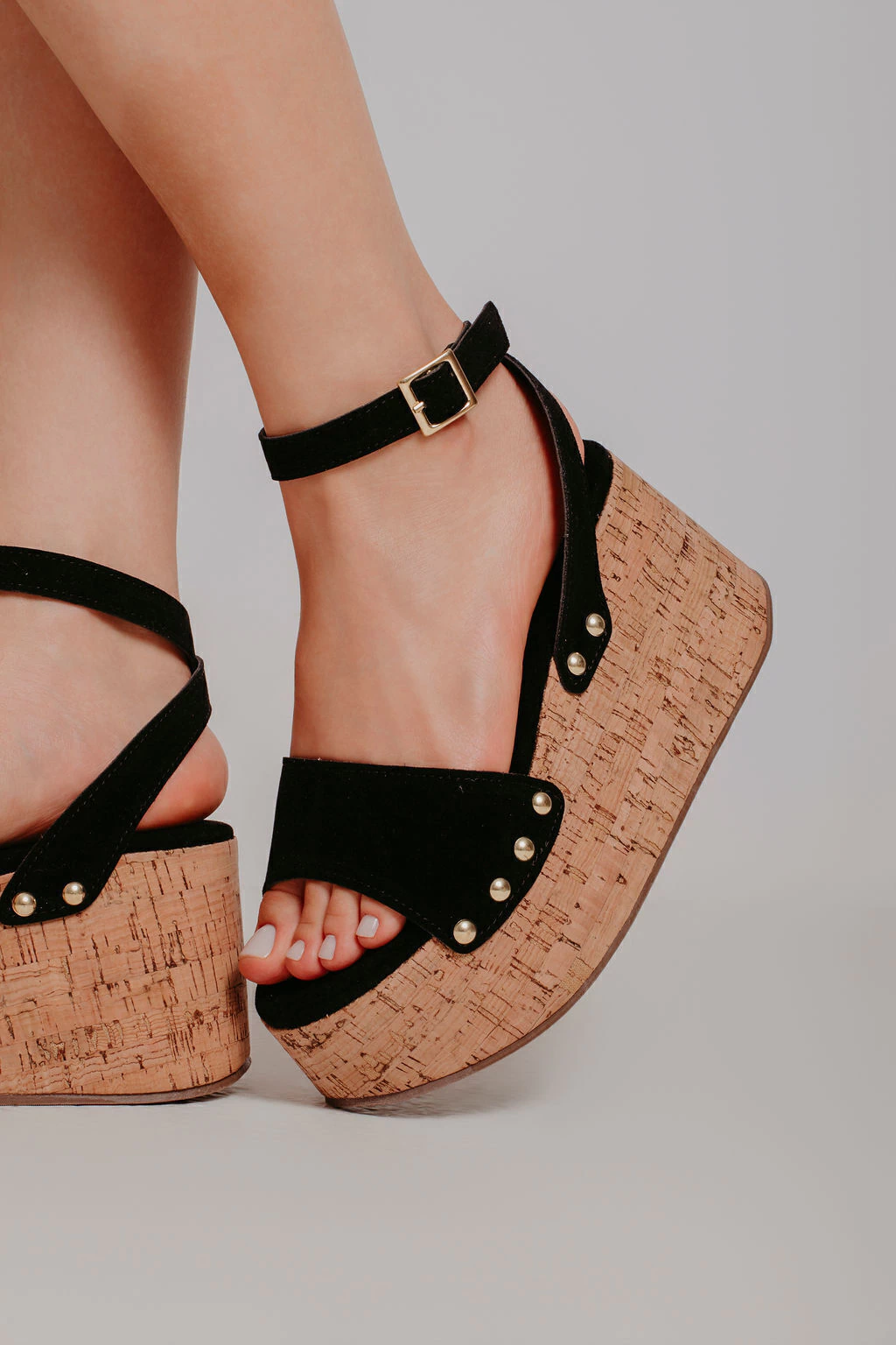 Esta plataforma destaca-se pela sua sola em cortiça natural, que confere um acabamento autêntico e sofisticado, enquanto as tiras largas com aplicação de tachas metálicas adicionam um toque moderno e cheio de personalidade. O fechamento ajustável no tornozelo garante segurança e ajuste perfeito para os seus passos.